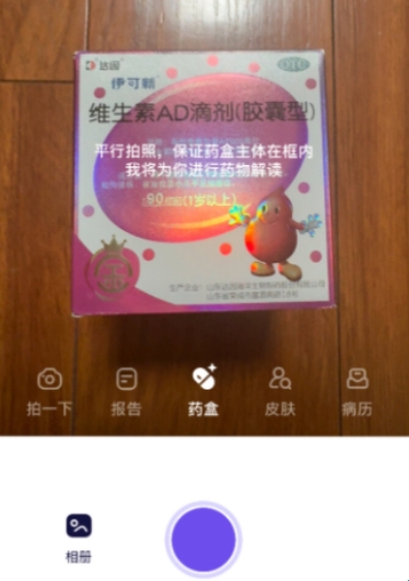 3、点击该按钮后无需额外切换分类,直接拍摄药盒就能触发药盒识别功能。