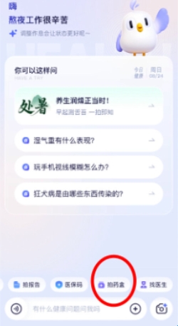 1、打开蚂蚁阿福APP后,进入首页的对话界面,点击拍药盒。