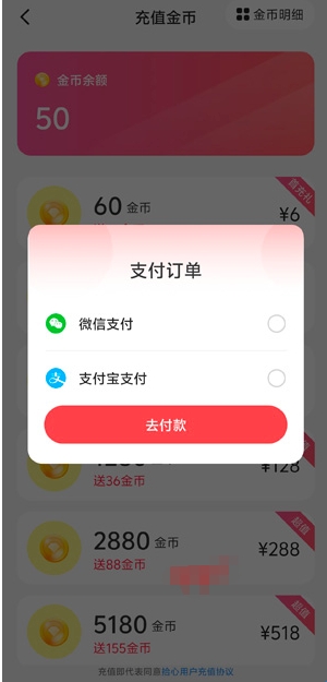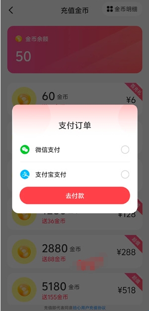 3、选择支付方式,完成支付后获得金币。