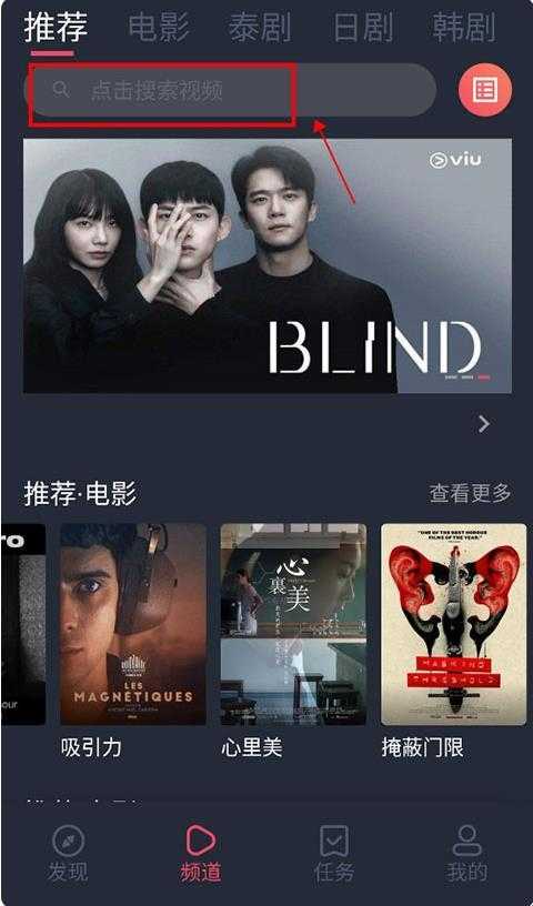 1、在“频道”页面上方的搜索框输入你想要搜索的剧名。