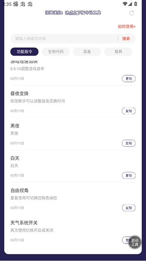 2、指令按功能清晰分类,支持关键词搜索,玩家可快速找到所需功能,无需记忆复杂指令,上手即用。