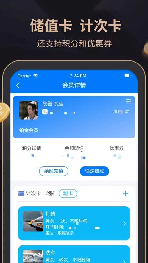 专业会员信息记录。灵活的会员卡规则设定。支持一人多卡。次卡,时段卡,限时优惠多种类型灵活设置。