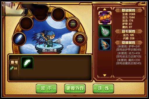 6、选择【洗练】可以对已经装备的羽毛进行属性洗练。