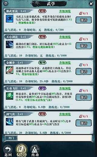 1、武学升级:每5级效果会大幅度提高,建议商城购买技能书,迅速提升。