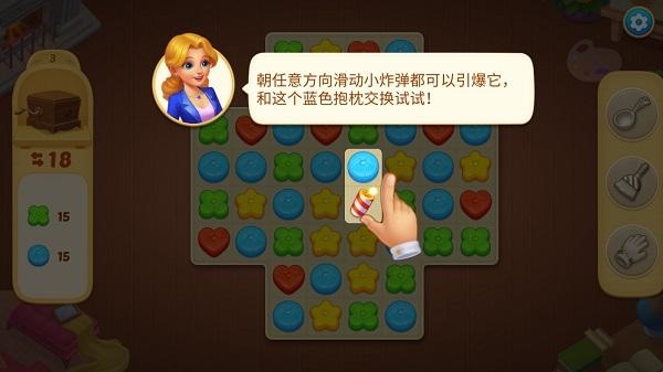 匹配方形的四个同色抱枕就能制作一个小炸弹,双击或朝任意方向滑动小炸弹可以引爆它。