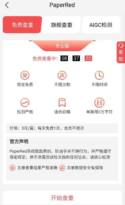 1、免费查重 PaperRed的核心功能是其强大的论文重复率检测系统。用户可享受免费查重服务,查重报告严格准确,检测速度非常快,查重结果与学校内系统接近一致。