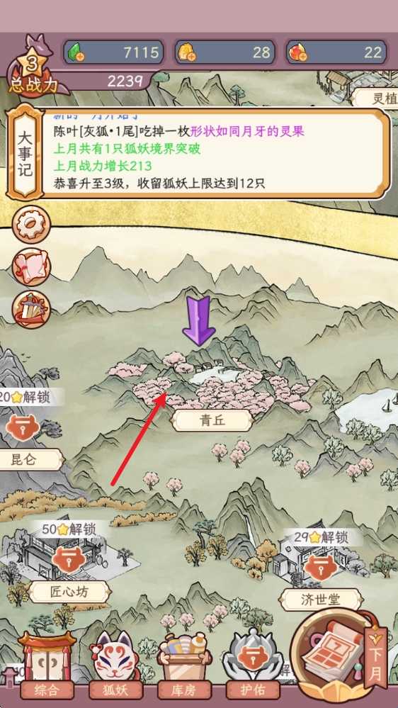 1、游戏分为了上侧的仙山和下侧的人间,通过人间的青丘我们可以收留各种狐狸。