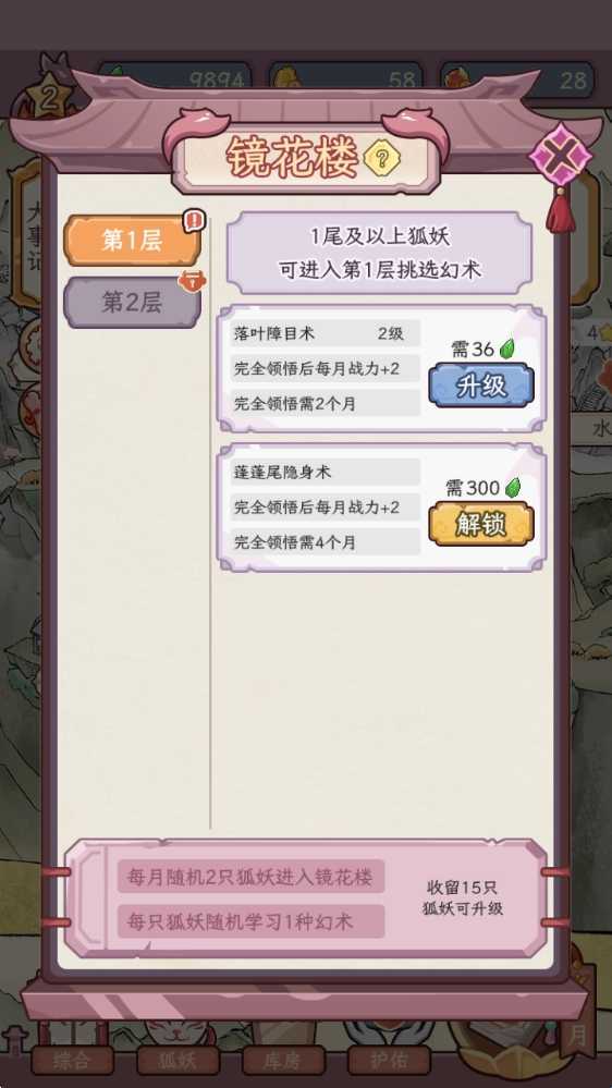 1、通过培育可爱的小狐仙们来升级,解锁更多修炼的场景,例如化形峰助狐妖们升级成为美人!