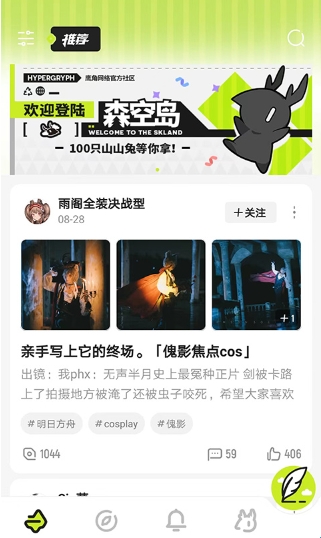 1、打开森空岛游戏社区软件,进入主界面,可看到玩家们分享的游戏资讯和游戏攻略,