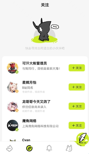 2、进入关注界面,可看到当前关注的用户,也可以选择画师、视频作者、攻略作者等用户关注,