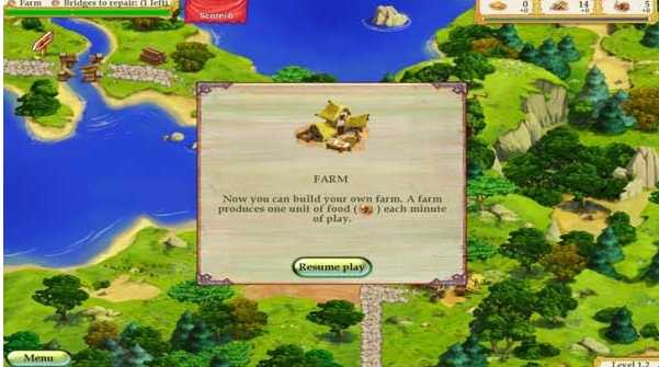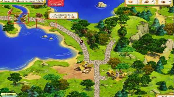 6、第二关就是要建造属于自己的农场。你不会总是有足够的粮食,所以你需要建立自己的农场。记住,你需要木材来建造一座建筑物。一旦你建造了一个农场,重建通往桥梁的道路和桥梁本身。任务:需要建造的建筑,需要修复的农场桥梁。