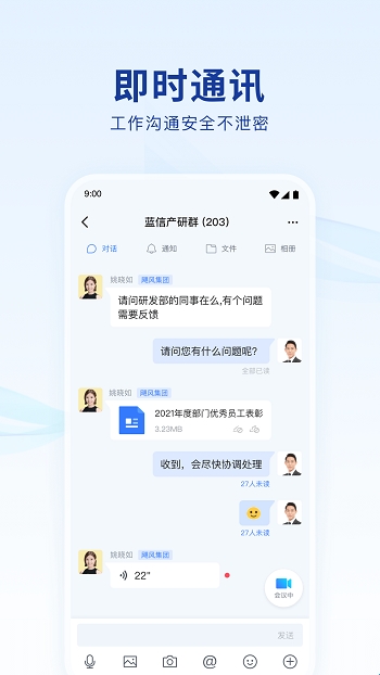 1.支持创建群聊,在线分享工作文件,各种格式文档、视频、图片等,都能共享