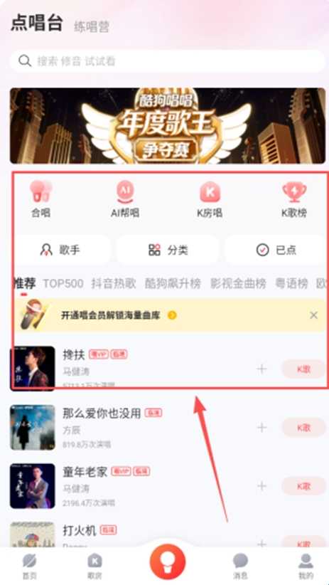 2、选择想要演唱的歌曲,点击歌曲右侧“K歌”按钮;