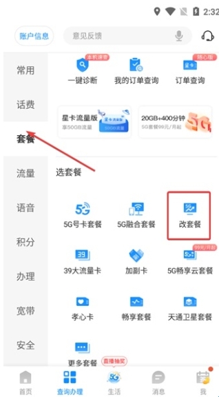 3、在查询办理主选项内,点击左侧“套餐”选项。