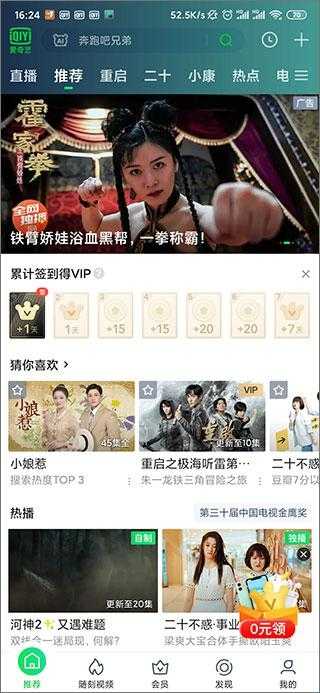 2、然后会看到推荐、随刻视频、会员、发现、我的五个板块,在推荐中有着大量的电视剧供用户观看,并且累计签到还能免费领会员哦!