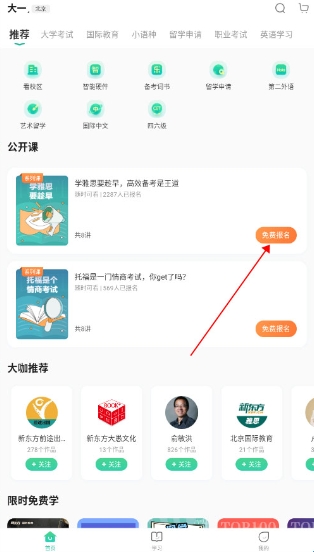 1、进入新东方app最新版本首页,点击需要报名的课程