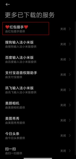 3、在更多已下载的服务页面中点击红包猎手按钮;