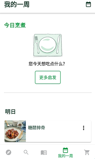 2、在【我的一周】页面,点击【更多启发】,来搜索选择一周菜谱;