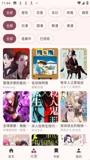 1、进入软件首页将漫画进行了冒险、恋爱、玄幻等详细分类。