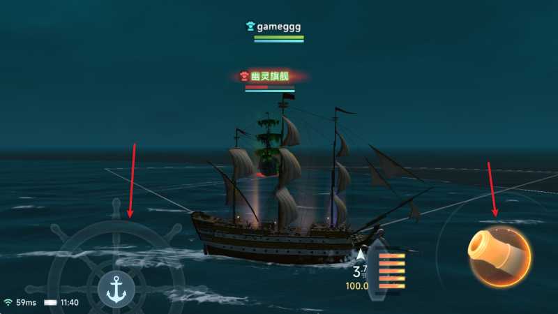 2、新手指引中,我们将会遭遇幽灵船的袭击,我们需要驾驶船来进行反击,左侧的船舵控制方向,右侧点击开炮。