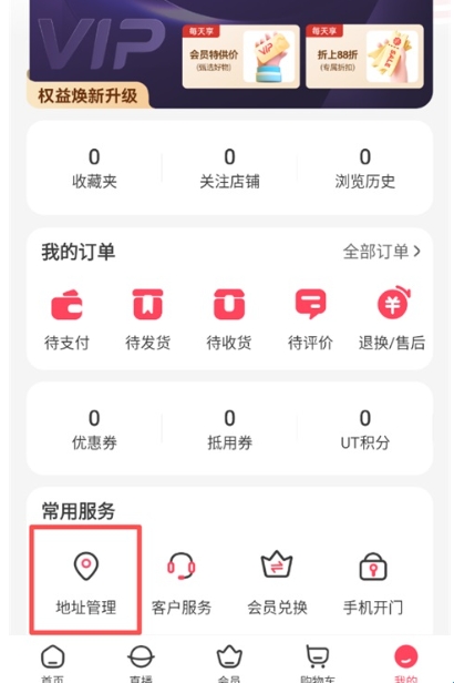 2、在个人页面"常用服务"栏中,点击"地址管理";