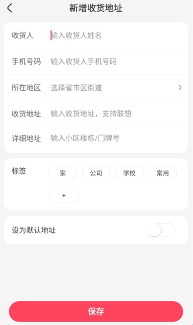 按需添加标签、开启"设为默认地址";信息核对无误后,点击底部"保存",完成操作。