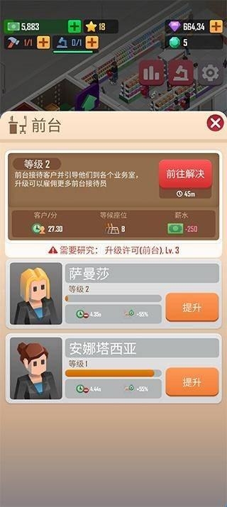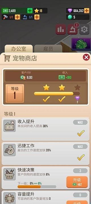 1、进入宠物大亨后,首先要升级办公室并管理好员工,这样才能为顾客提供更优质的服务。