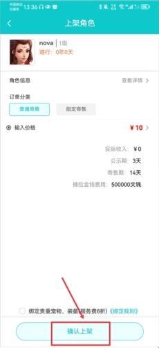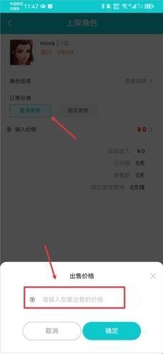 4、例如角色上架,在上架角色界面中选择订单分类后,输入你要出售的价格