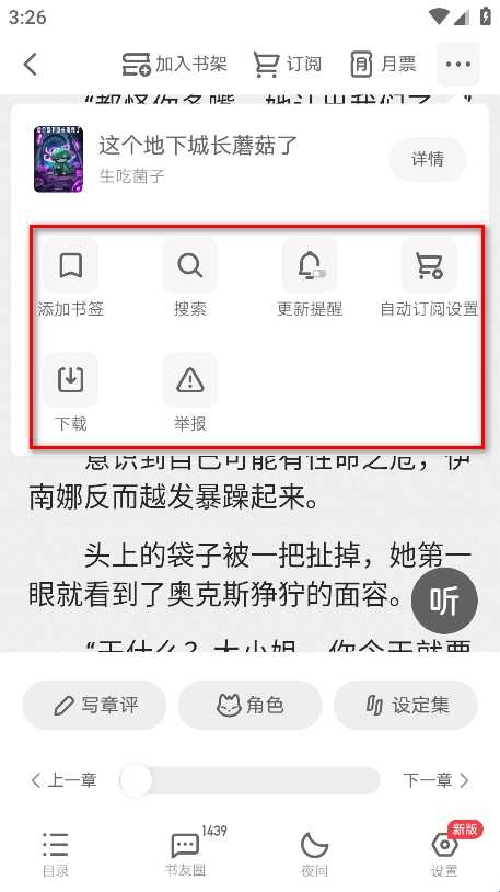 5、点击手机屏幕,即可看到本界面支持添加书签、搜索、更新提醒、下载等功能。