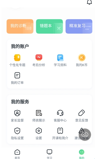 提供我的诊断、错题本等学习辅助工具,及家长监督、师资展示等服务设置,能定制学习体验、解决问题,管理学习全流程。