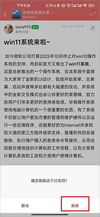 4、在跳出的弹框内,点击“删除讨论”即可。