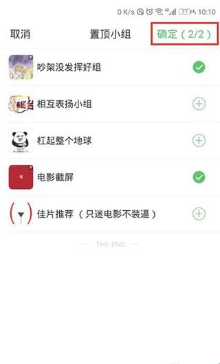 4、接着,选择需要置顶的小组,再点击右上角的“确定”。注意,置顶的小组最多不能超过两个;
