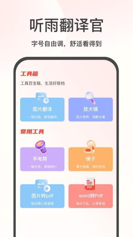 听雨翻译官是一款集多种实用工具于一体的便捷应用,如同一个掌上的百宝箱。软件在首页设计了清晰的分类,让你能够一键快速调用图片翻译、放大镜、手电筒、镜子等常用功能,操作简单直观,随时随地满足你的日常需求。