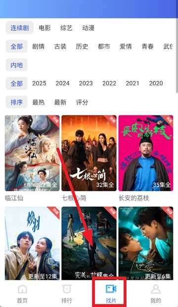 1、在本站内下载安装并打开彩虹视频app,点击找片,可以按“电视剧/电影/综艺/动漫”标签,如选择“电视剧”,浏览推荐剧集。