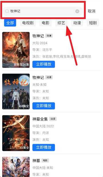 2、点击首页顶部“搜索”按钮,输入关键词,在搜索结果中选择对应影片。