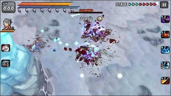 如果手指点在屏幕上向某一方向快速滑动,而且该方向有敌人(非BOSS),角色就会发动绝杀技,瞬间杀死该名敌人并回复一定的血量,会消耗大量耐力