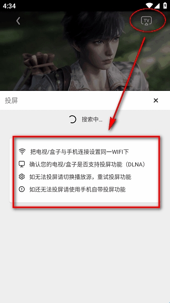5、注意了,投屏前,前保证手机和电视连接的是同一wifi,不然搜索不到设备。