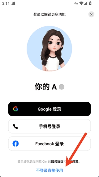 2、用户切换ip后即可不会弹出地区限制的提示了,就可以正常使用了,底部会出现一行【不登录直接使用】的文本,点击即可进入使用了