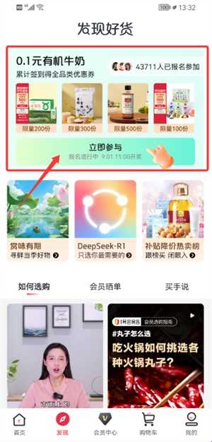 1、启动1号会员店应用后,进入发现页面,可在活动专区点击立即参与按钮。
