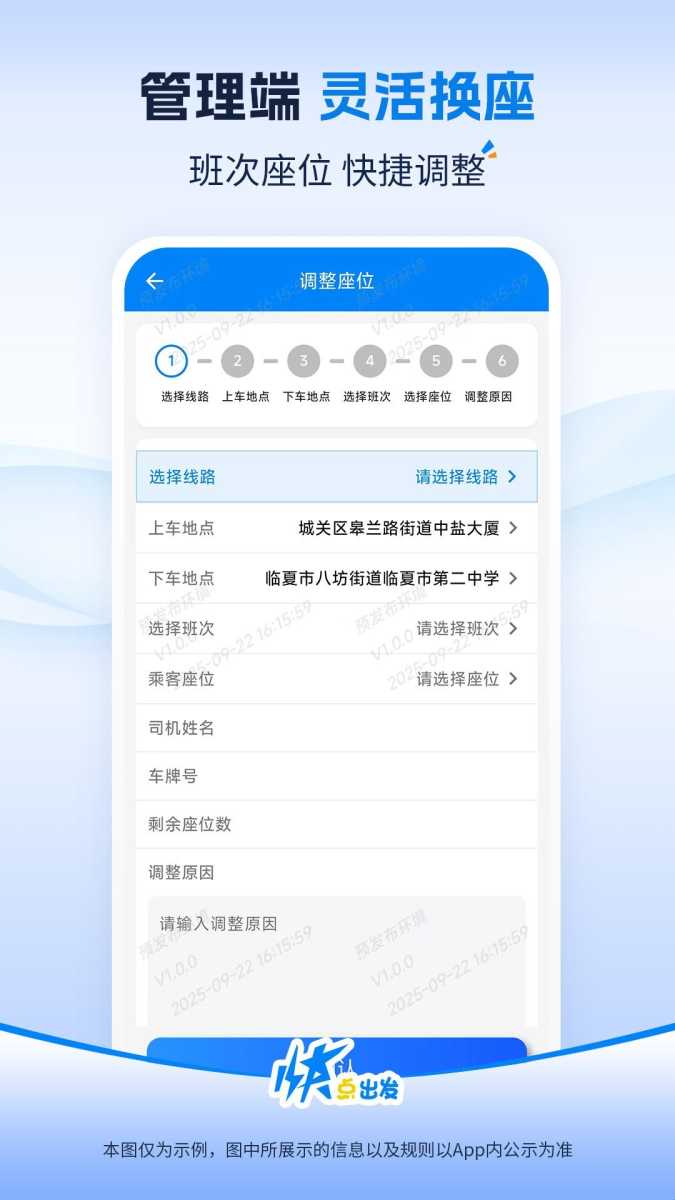 快点出发管理是由临夏道合科技开发有限责任公司倾力打造的一款专业交通管理平台,专为客运公司调度人员量身定制。通过这款软件,您可以轻松查看当日所有班次信息,快速新增班次,灵活编辑班次详情,还能实时在线取消订单、办理退款和改签等便捷操作。