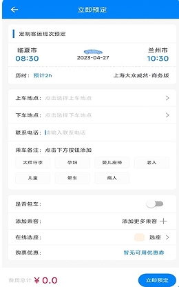 2、轻松在线预订出行车辆,能够结合班次的信息,在线立即预订出行。