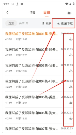 然后在目录页面,选择自己想听的剧集下载即可,也可以使用批量下载