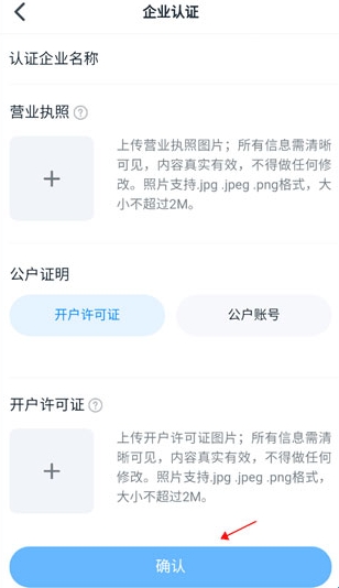 3、上传自己公司的营业执照和许可证,最后点击“确认”,等系统审核通过就表示认证通过了
