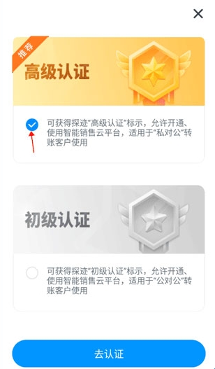 2、有两种认证方式,选择第一个高级认证,然后点击“去认证”