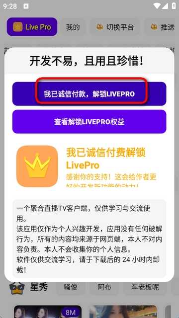 点开左上角的Live Pro,然后选择我已诚信付款,解锁lveepro。