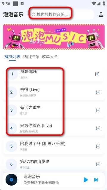 泡泡音乐,一款完全免费的听歌神器,让你随时随地享受纯净音乐时光。无需会员订阅,也无任何广告干扰,内置超强搜索功能,一键即可找到心仪歌曲。同时,平台汇聚海量热门音乐资源,用户无需费心在网络上搜寻下载。