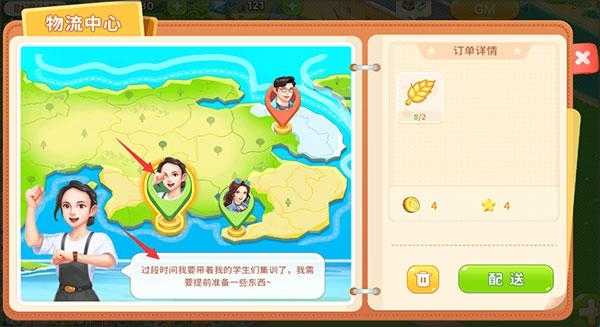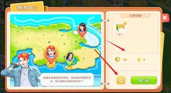 3、左侧NPC边框显示红色,代表订单所需货物不够,需要补充后才可以配送,绿色边框代表货物充足,可以配送,点击右侧下方配送即可获取经验与金币。