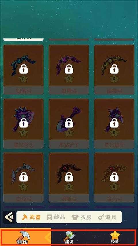 5、进入菜单界面,分为制作、建设和技能栏目,