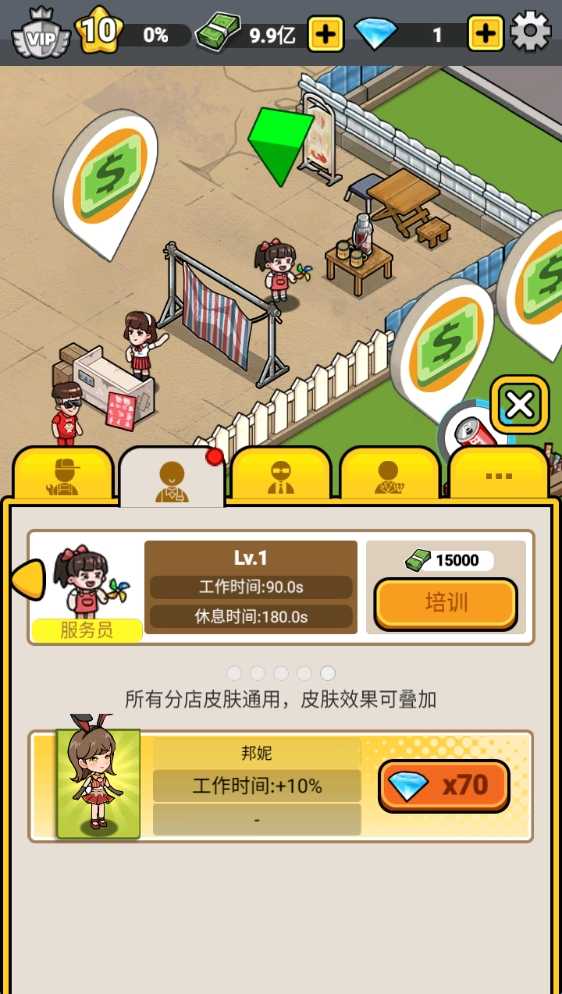 1、进入游戏后,我们可以看到场景中的顾客在自由行动,点击人物上方的按钮即可完成经营。