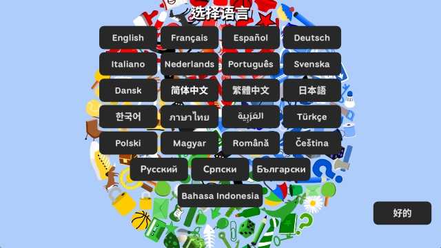 1、进入游戏后,如果没有默认为中文,点击右下角的地球图案,在这里就能切换中文。